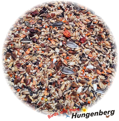 Mariendistelsaat, Sonnenblumkerne gestreift, Kardysaat, Perillasamen Weiss, Perillasamen Braun, Leinsaat, Negersaat, Haferkerne, Hirse Rot, Kanariensaat, Rübsen, Hanfsaat, Buchweizen, Hagebuttensaat, Haferkerne, Vogelbeeren, Grassamen, Knaulgras