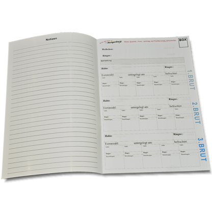 Für 20 Zuchtpaare mit jeweils 3 Bruten, sowie Platz für Notizen.